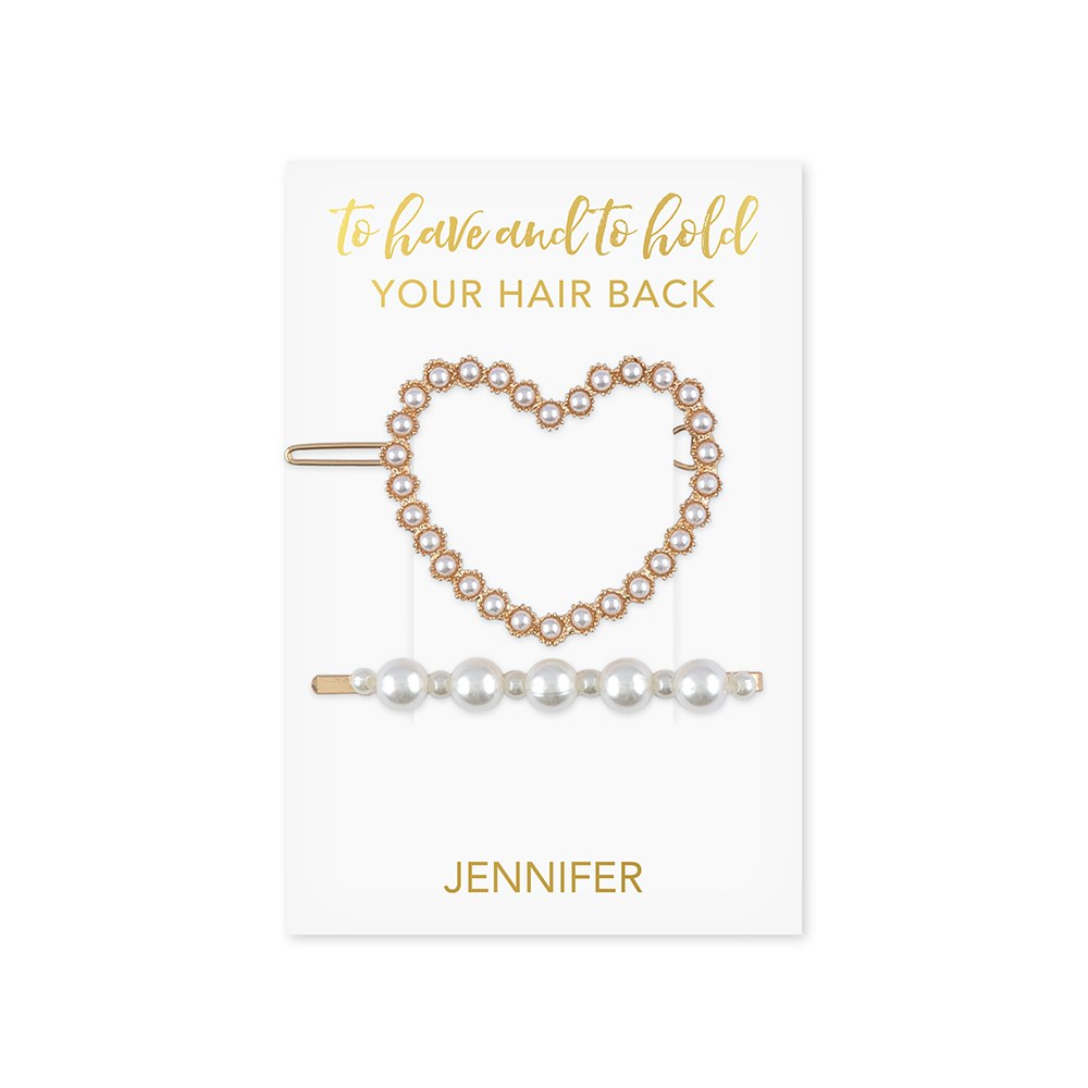 A special way to fancy up your hairdo, our unique sets of gold, rhinestone, and faux pearl decorated hair clips are the perfect bridal party gift for your best girls. Hair accessories they can wear on the wedding day and use after the big event too! Much like standard bobby pins, the sparkly slide hair clips are highly versatile. Not just decorative, they can be used to pull your hair to the side artfully or to help pin fancy updos. Choose from five unique slide-style hair clip collections to go on the custom, name printed "To Have and To Hold Your Hair Back" backer card: Pearl, Pearl Heart, Rhinestone Heart, Emerald Gemstone, and Gold Bow. Sparkly, elegant, or just plain cute, each pin in the set is a unique design because variety is the spice of a girl’s life! You can choose the collection best suited to the bride-to-be, bridesmaids, and flower girl dresses or the hair bling that’s best suited to the bridal party member they’re meant for. They’re a fun, cheap way to say a small thank you to your bride tribe or a cool way to make your bridesmaid proposal.