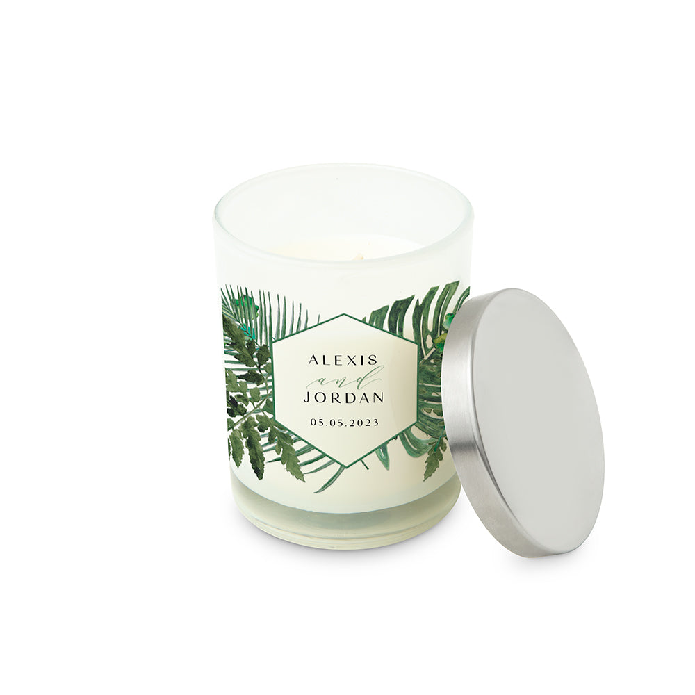 The personalized candle jar is lightly frosted glass with a silver metal lid. It has a simple but modern look that is suited to different decorative styles. With the colourful printed design, the candle is a cute inexpensive gift idea for birthday present, thank you gift, or bridesmaid favour. Cheap in price, add a name or short line of custom text to the "Modern Couple" design to customize the candle and make it a special keepsake. Each candle is made with undyed, white vegetable wax. With a lower melting point, the vegetable wax candle will last a good long while. Available unscented or in apples & cinnamon or fresh linen scents. Create a cozy atmosphere with the apple and cinnamon scent, freshen a room with the crisp, airy aroma of freshly laundered clothes, or keep it unscented to get the warm glow of the candle without affecting scent-sitive company. Once you have used all the wax has, you can then use the empty candle jar as a fancy, decorative container for other items because of its lid!